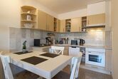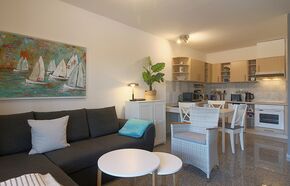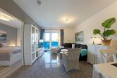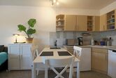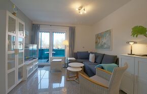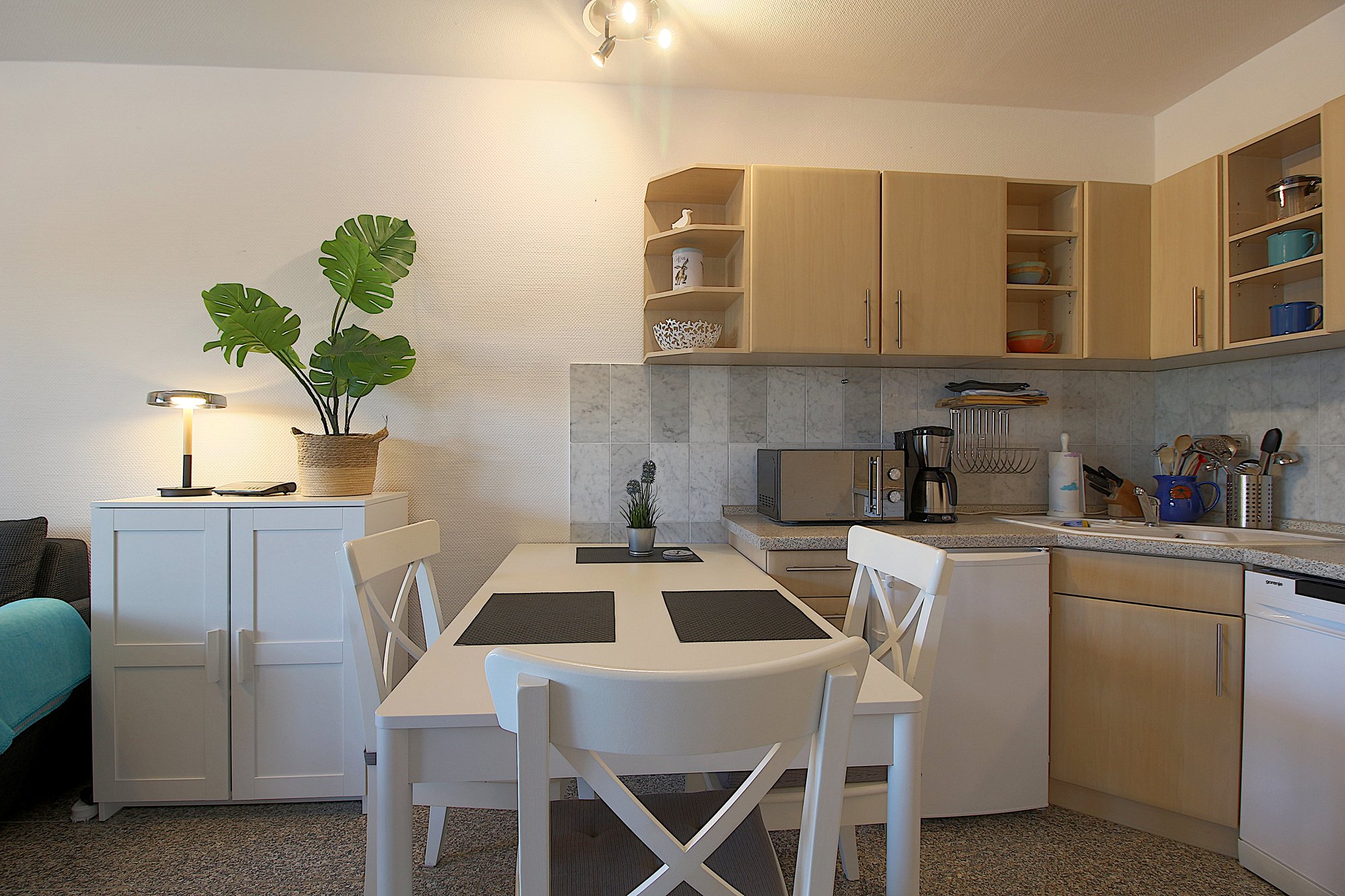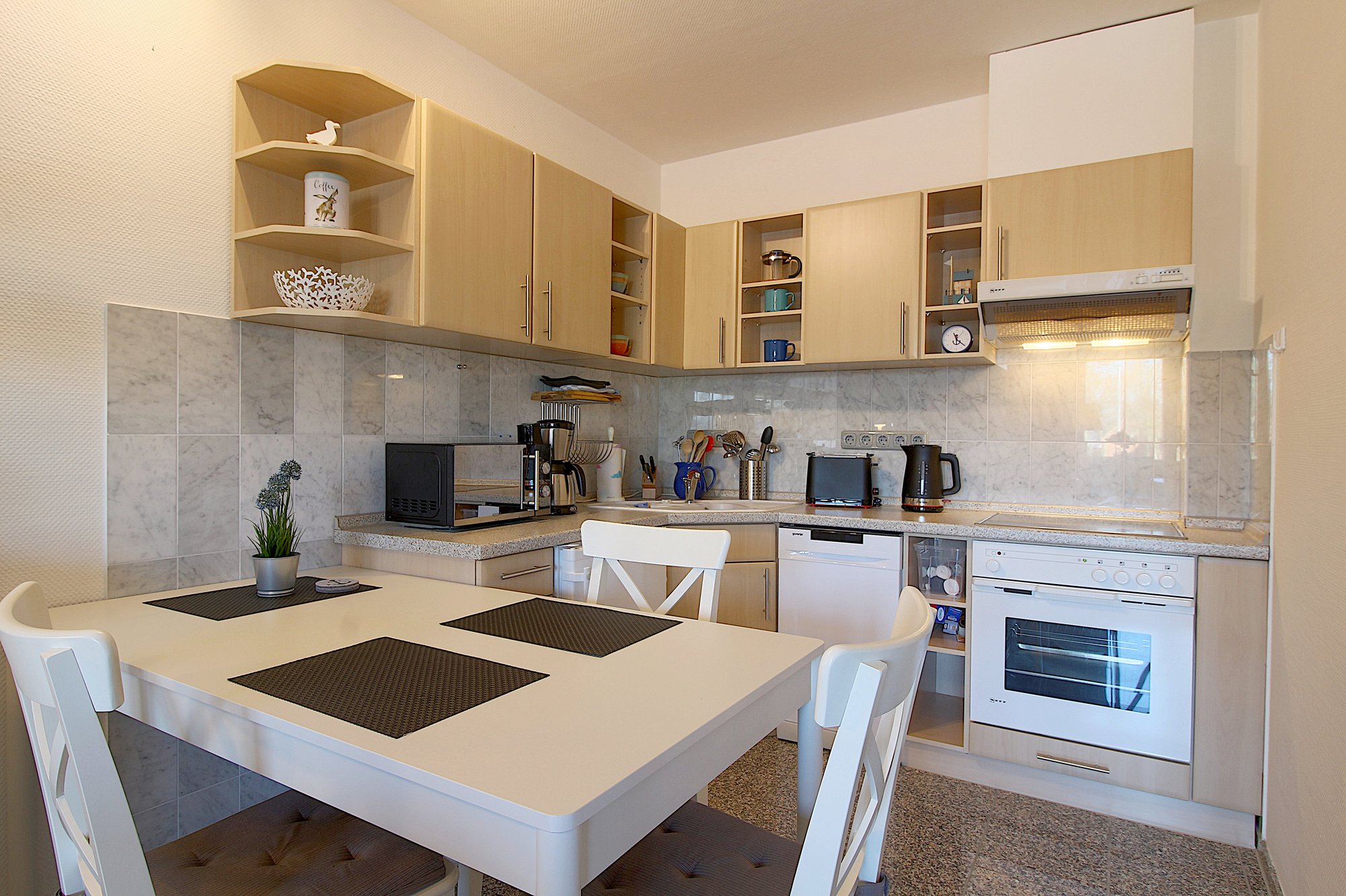 Im frischen, jungen Look präsentiert sich diese Nichtraucher- Ferienwohnung mit einem Schlafraum mit Doppelbett (1,60 x 2,00 m), großer Küchenzeile mit Geschirrspüler und Wohnraum mit Sitzecke und TV. Hochwertige Fußböden mit Granit.