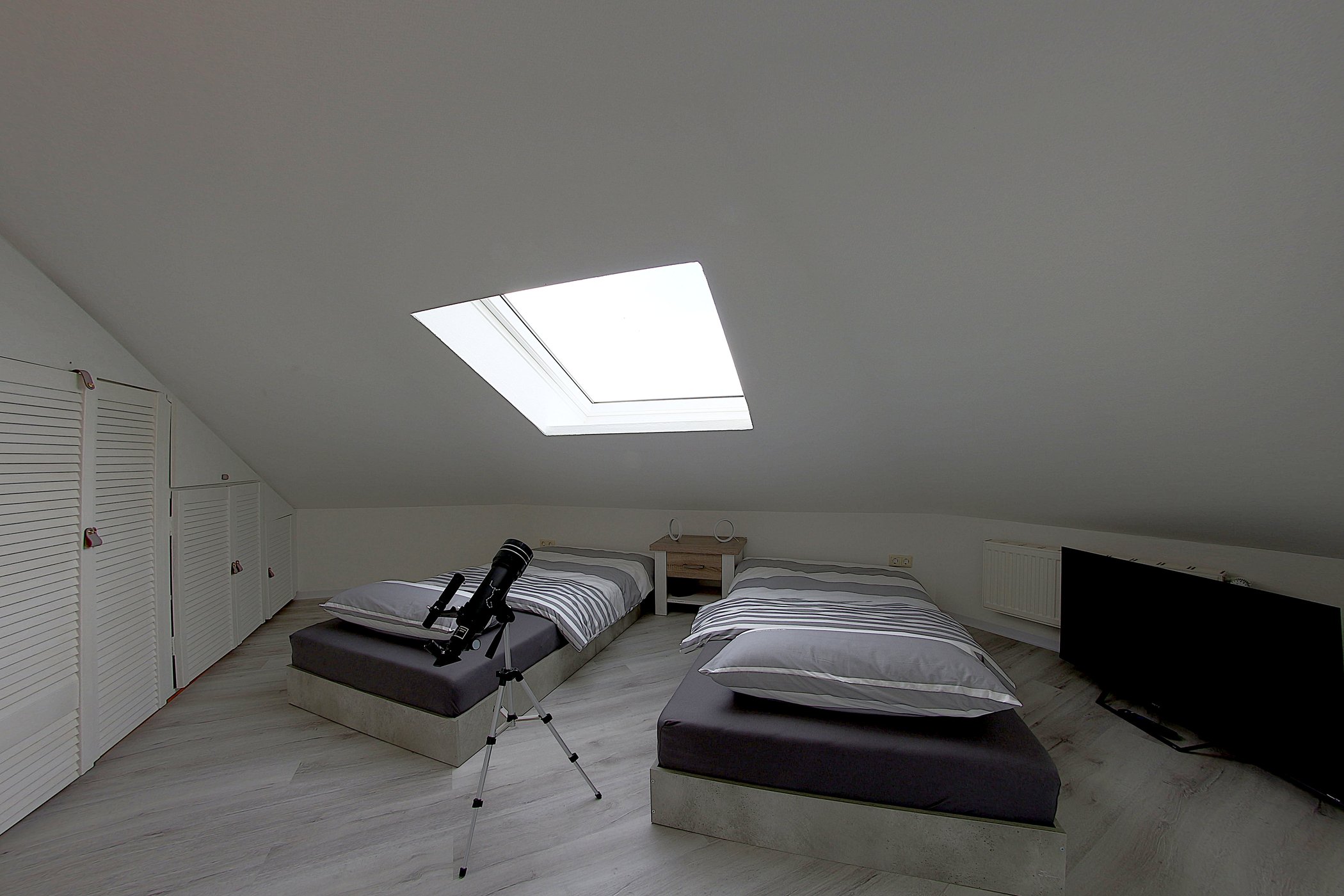 Im Obergeschoß befindet sich ein Schlafzimmer mit 2 Einzelbetten, die auf Wunsch zu einem Doppelbett verbunden werden können. Ein Flachbildfernseher steht zur Verfügung (Streamingdienste können mit eigenem Account genutzt werden). Mit dem Teleskop ist für Groß und Klein ist der Blick in die Sterne sicher.