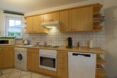 Die offene Küche mit E-Herd mit Backofen, Kühlschrank mit Gefrierfach, Kaffeemaschine, Toaster, Mikrowelle, Geschirrspüler und komplettem Geschirr lädt zum kochen ein.