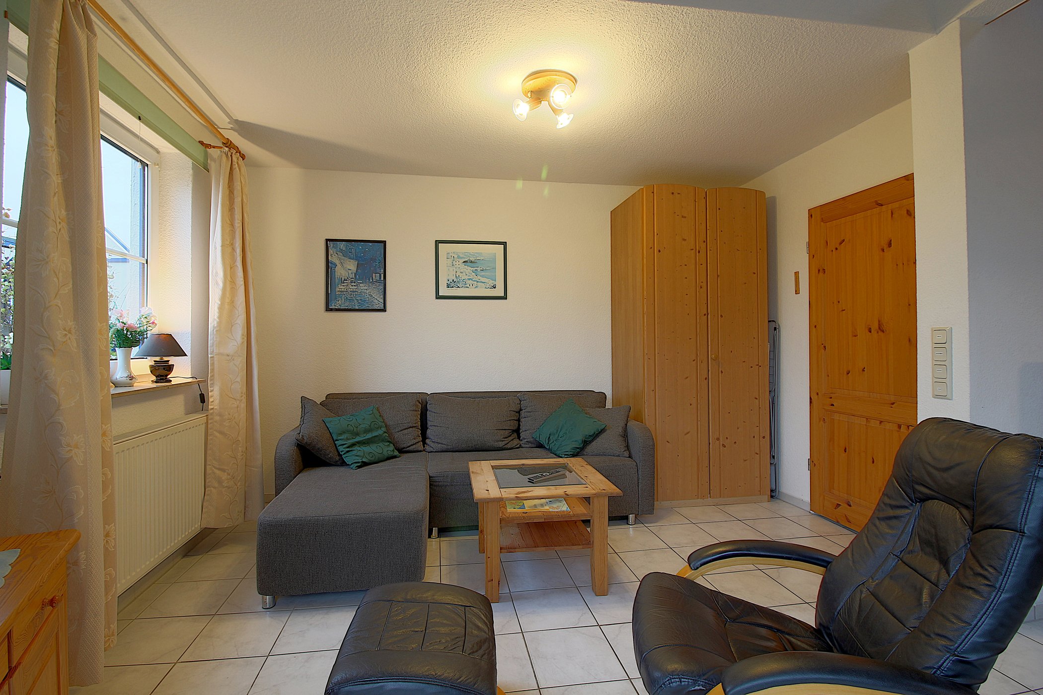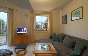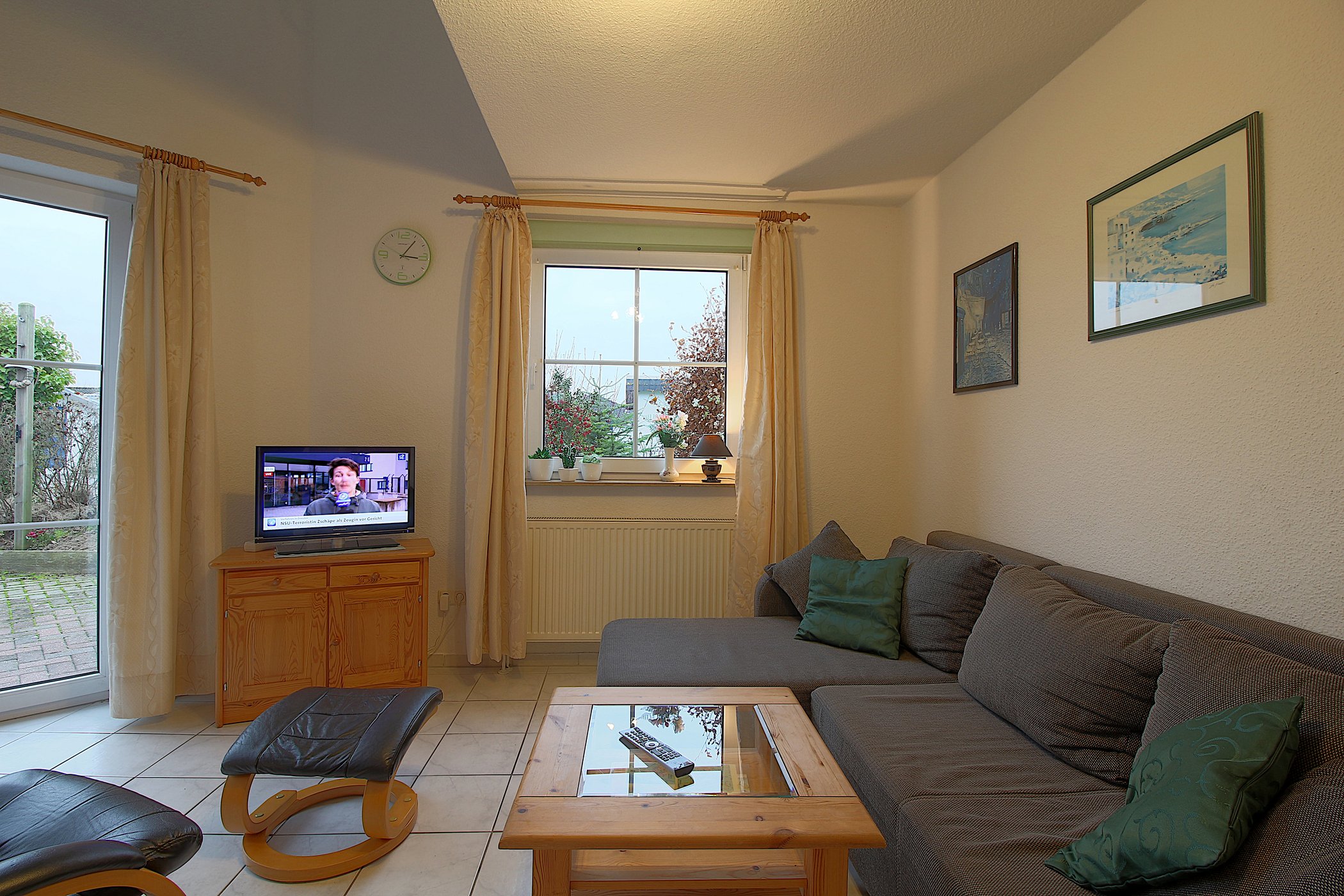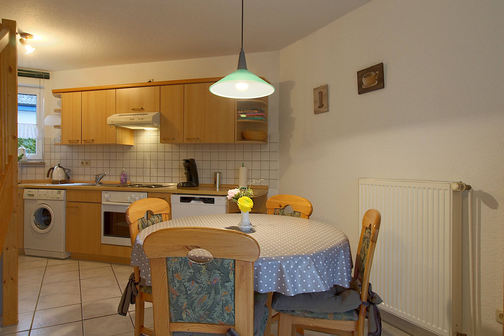 Im Erdgeschoss verfügt das Haus über einen komplett gefliesten Wohnbereich mit Flachbild-TV, Sitzecke, Essplatz für 4 Personen und Ausgang auf die Terrasse.