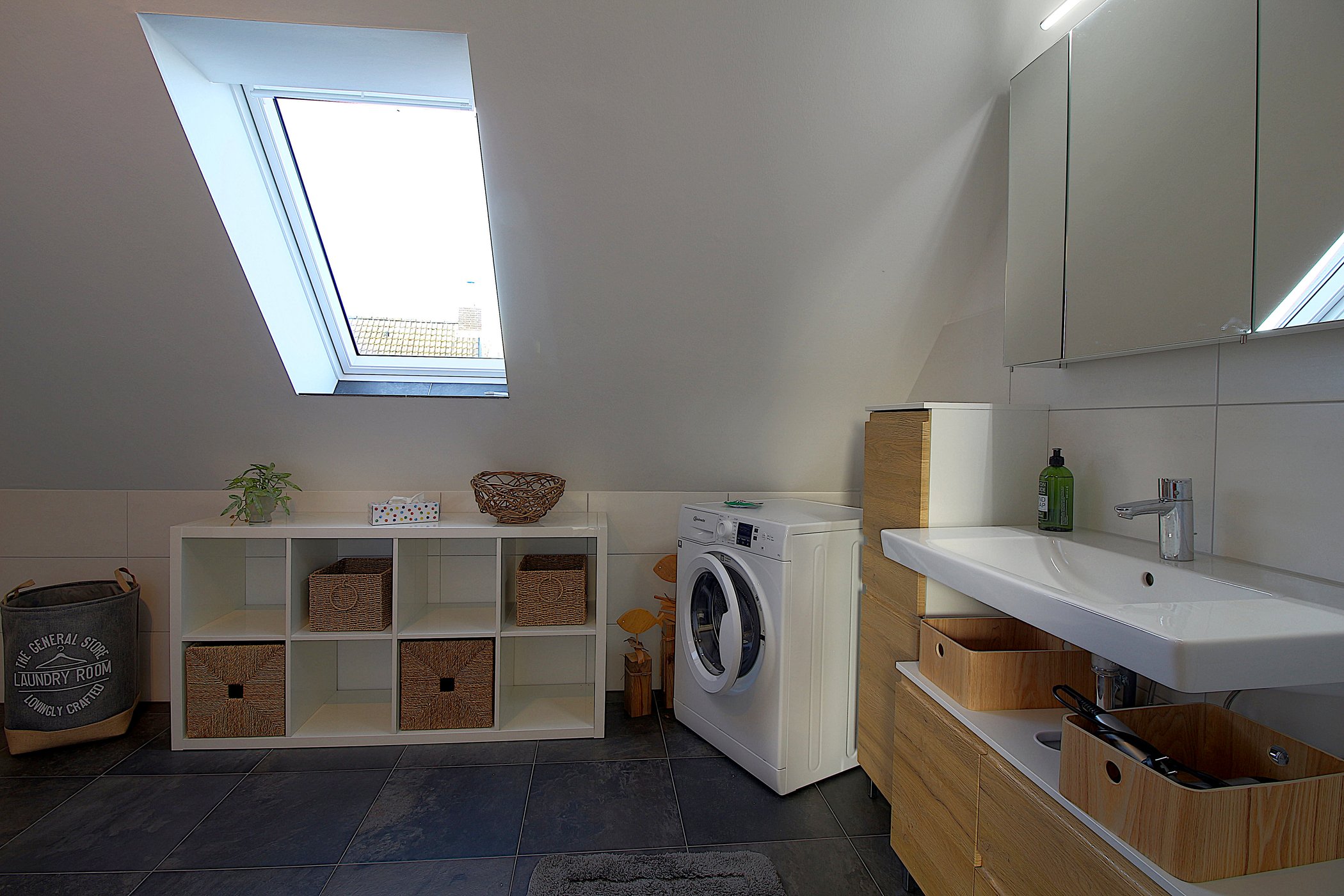 - Modernes Duschbad mit bodengleicher Dusche, Fenster und Waschmaschine